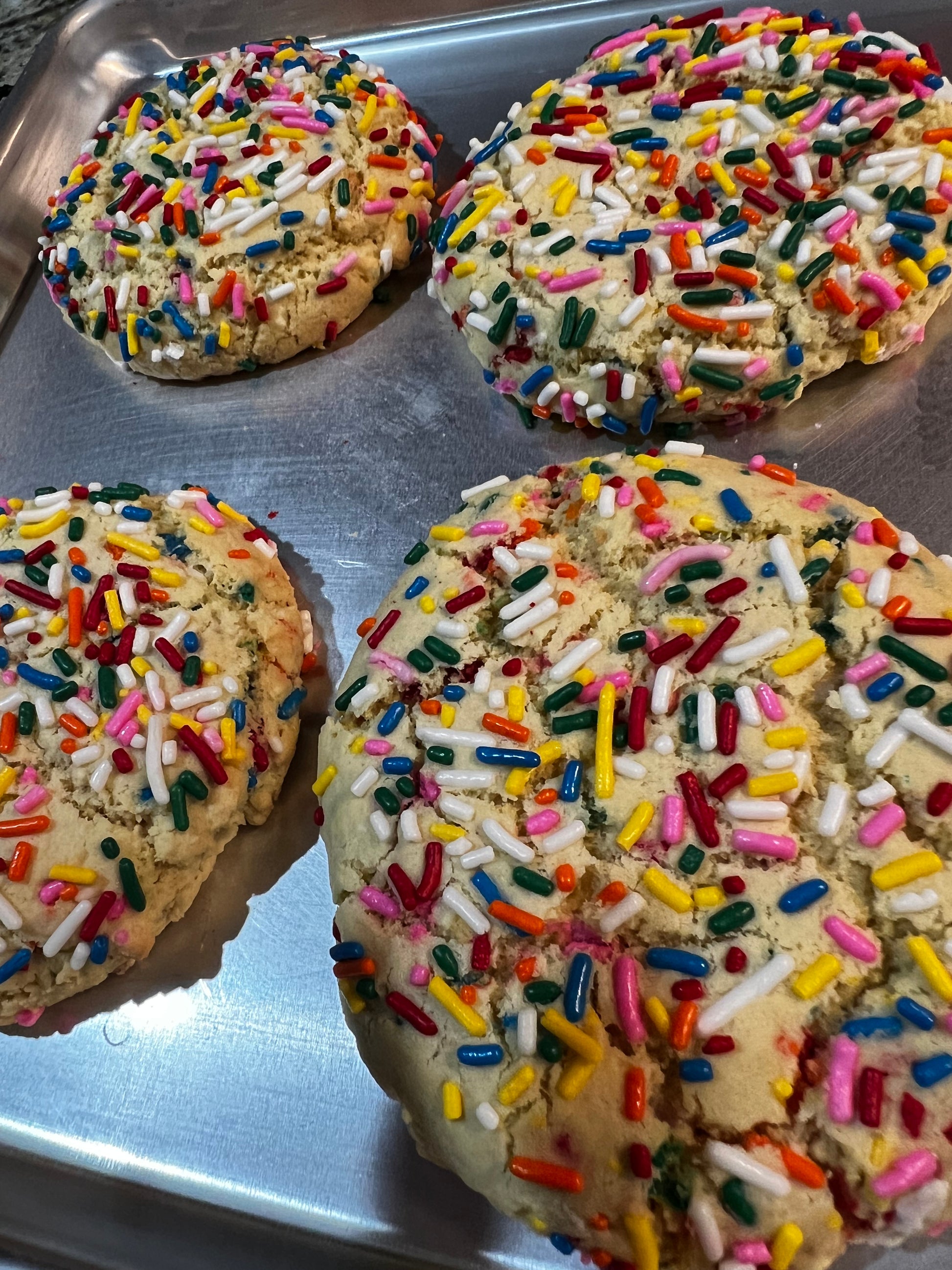 A birthday cake flavored sugar cookie base loaded with sprinkles and white chocolate chips. Stuffed with golden Oreo!