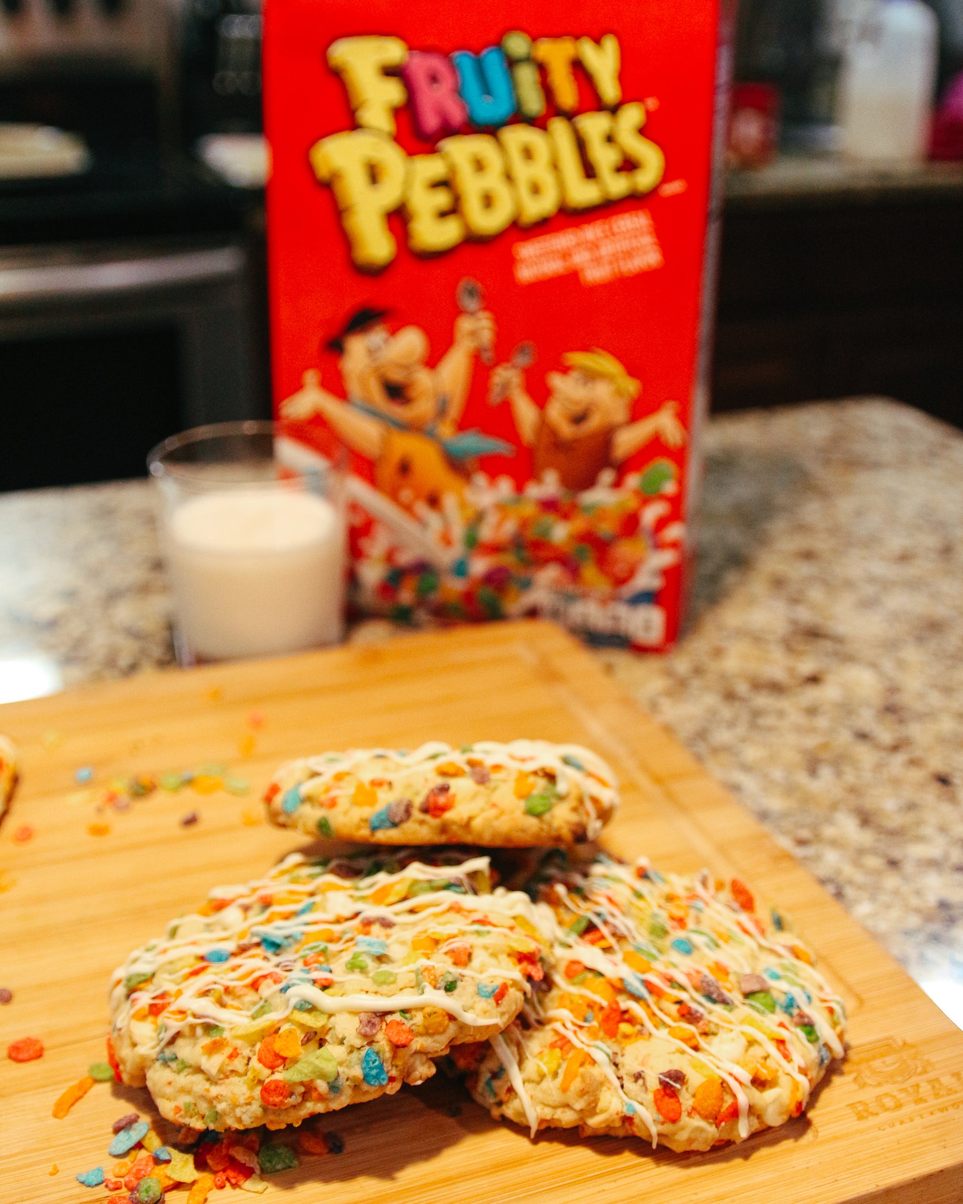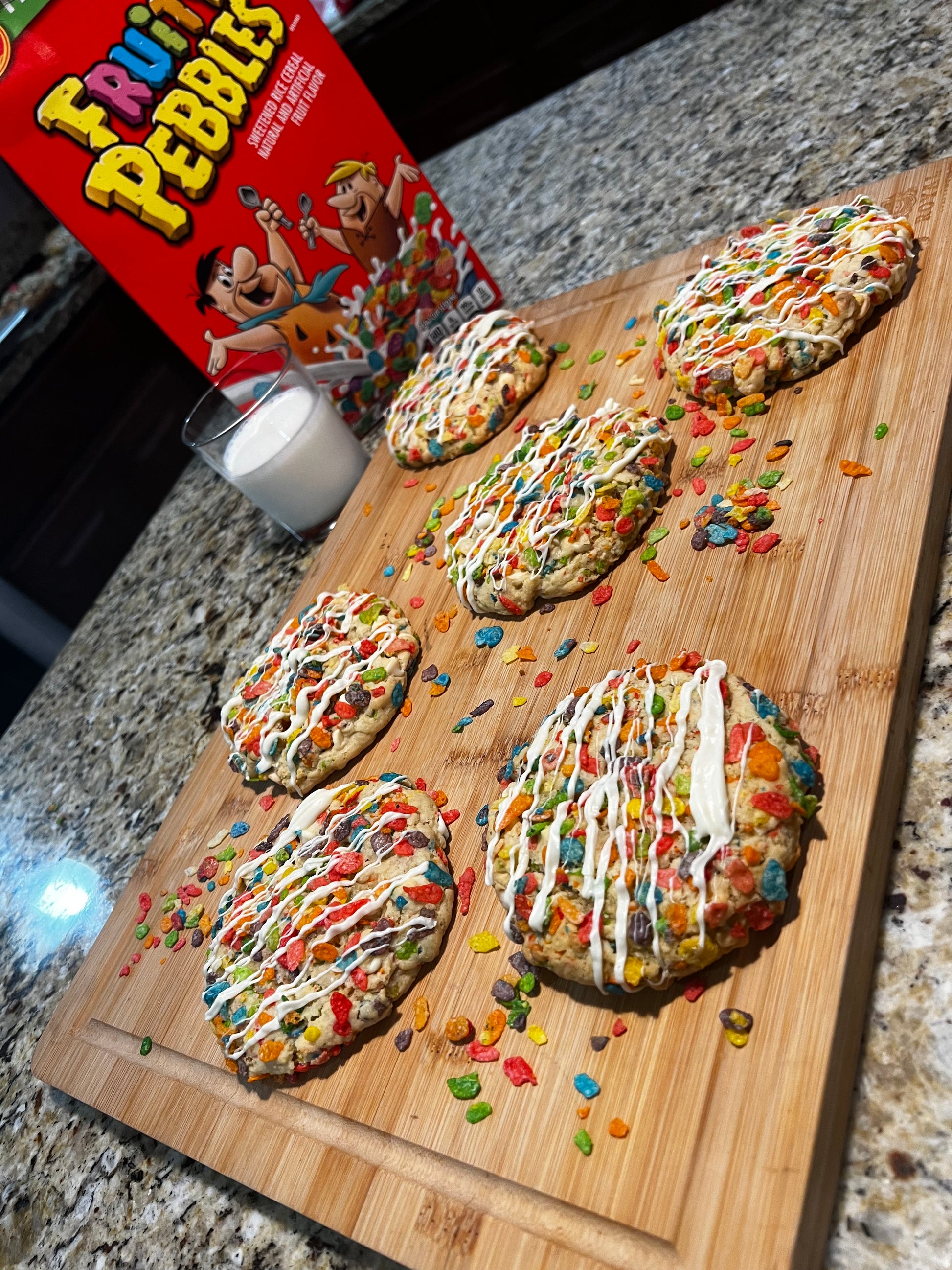 Our sugar cookie base packed with Post’s Fruity Pebbles cereal and white chocolate chips. Topped with a white chocolate drizzle and stuffed with a golden Oreo!