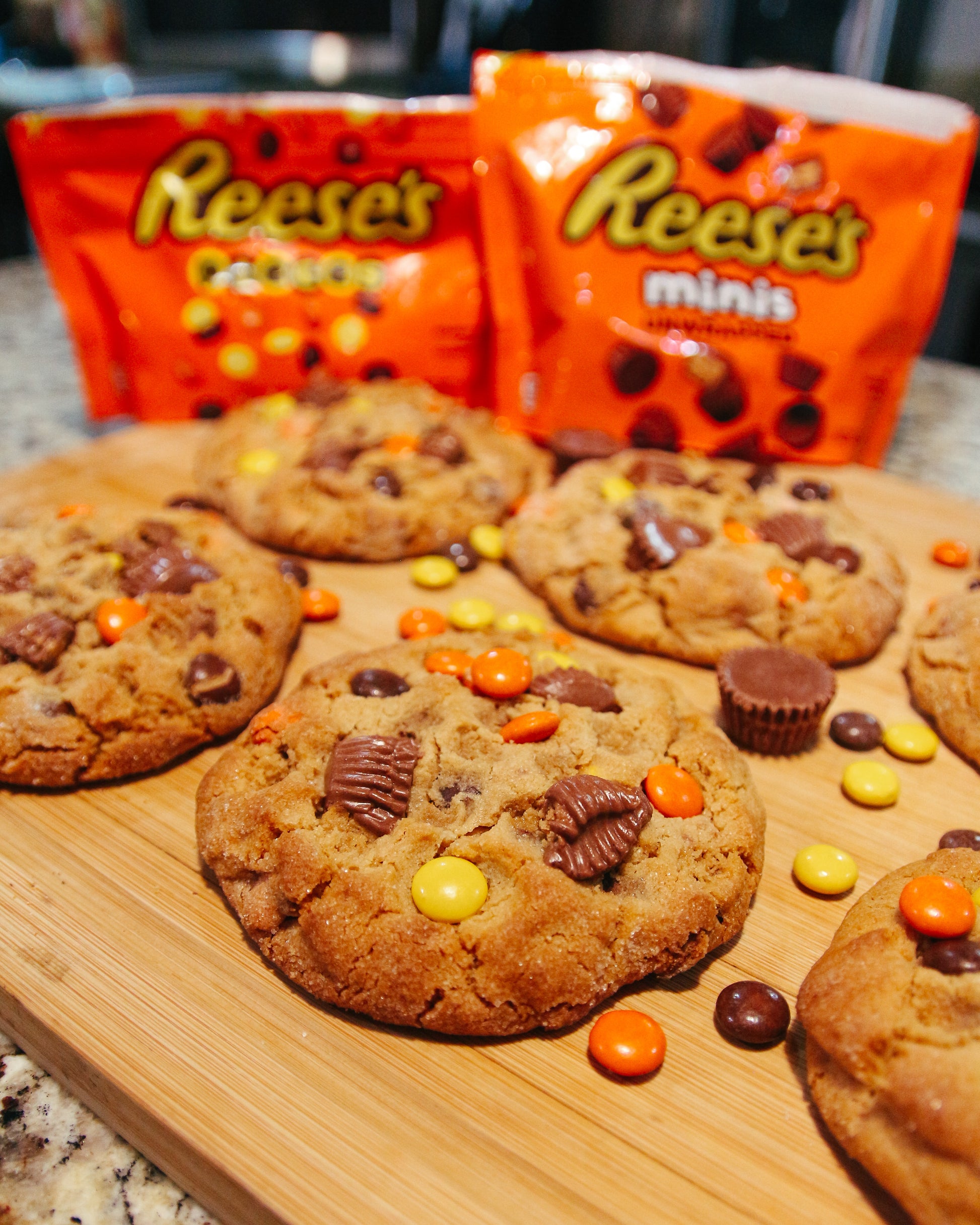 A peanut butter cookie base overflowing with Reese’s peanut butter cup pieces and Reese’s pieces. Stuffed with another Reese’s peanut butter cup!